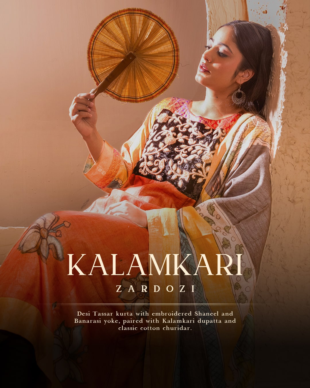 Crafted in rich desi tassar, this kurta set is a celebration of depth, heritage, and craftsmanship. The kurta features luxurious shaneel hand embroidery with zardozi and a vintage Banarasi yoke that adds a subtle sheen and regal charm. Paired with a matching desi tassar dupatta, hand-painted in pen Kalamkari, this look exudes artisanal elegance. The cotton churidar adds grounding comfort, making it a wearable piece of art.