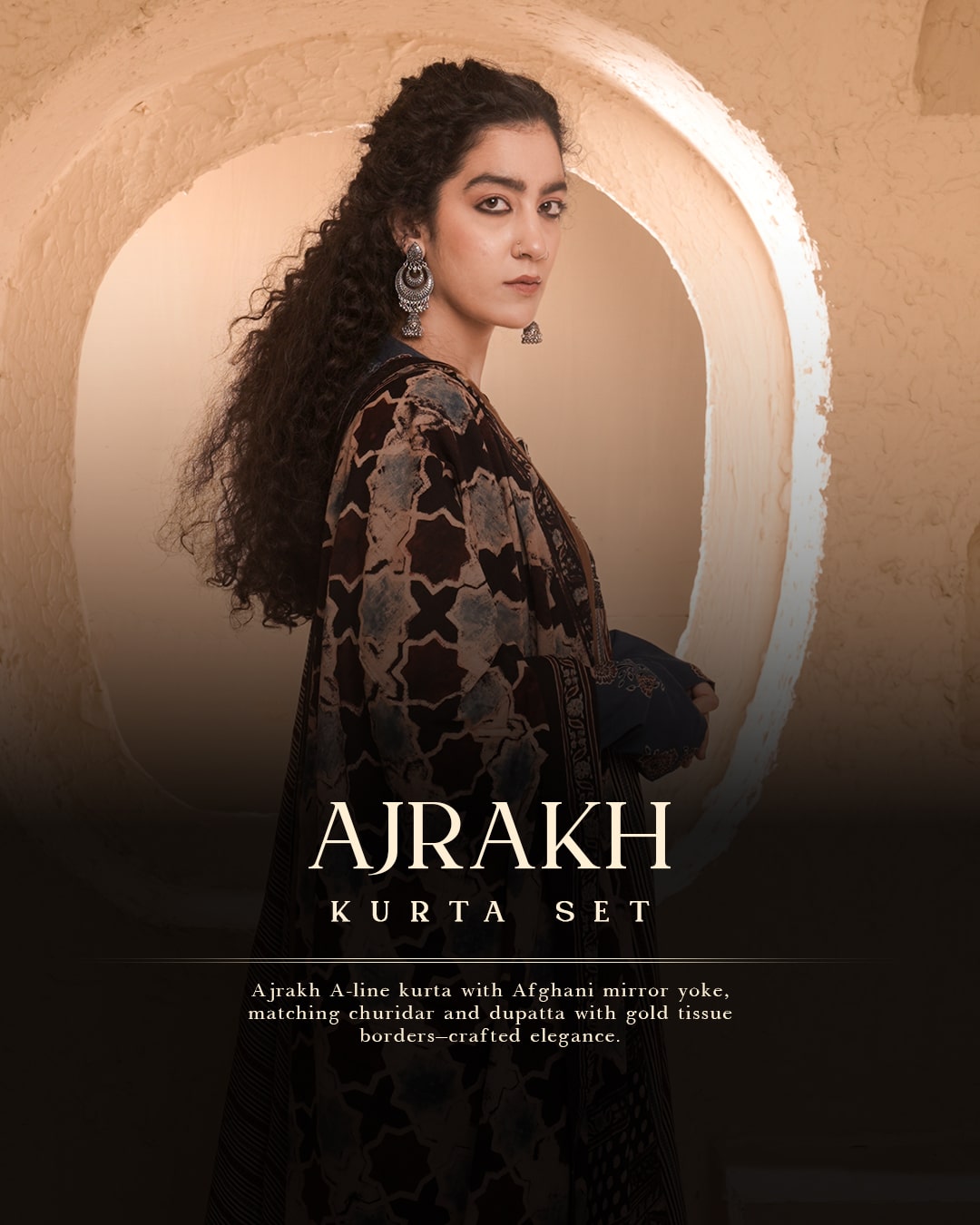 Designed for effortless grace, this Ajrakh kurta set is crafted in breathable cotton and features a flattering A-line silhouette. The Ajrakh print — timeless and earthy — is brought to life with a statement Afghani mirror-work yoke, adding a touch of folk glamour. The coordinated churidar and dupatta carry forward the visual story, with the dupatta finished in shimmering gold tissue borders that enhance the ensemble's festive appeal.