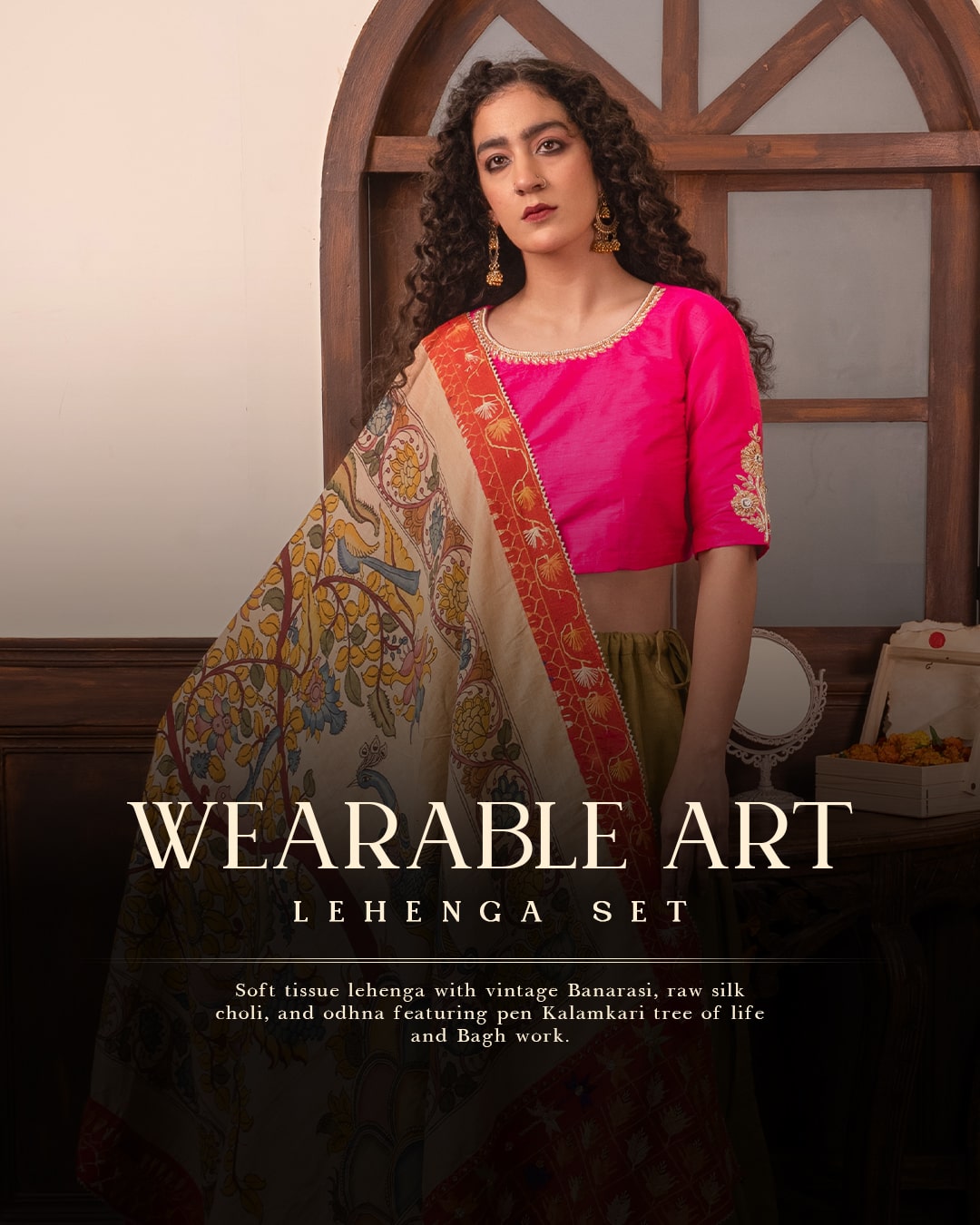 This lehenga set isn’t just attire — it’s a storytelling piece. The Wearable Art Lehenga Set features a soft tissue base skirt bordered with vintage Banarasi, lending it a timeless charm and rich texture. The choli is crafted in raw silk and intricately hand-embroidered, creating a tactile contrast to the shimmer of the lehenga. But the masterpiece lies in the odhna — a breathtaking Tree of Life is painted in traditional pen Kalamkari, interwoven with bagh work on Bangalore silk and khaddar, turning the drape into a canvas of heritage and devotion. Whether you wear it for weddings, festivities, or cultural showcases, this set bridges craftsmanship with elegance. Offered semi-stitched with tailored options for a truly bespoke experience.