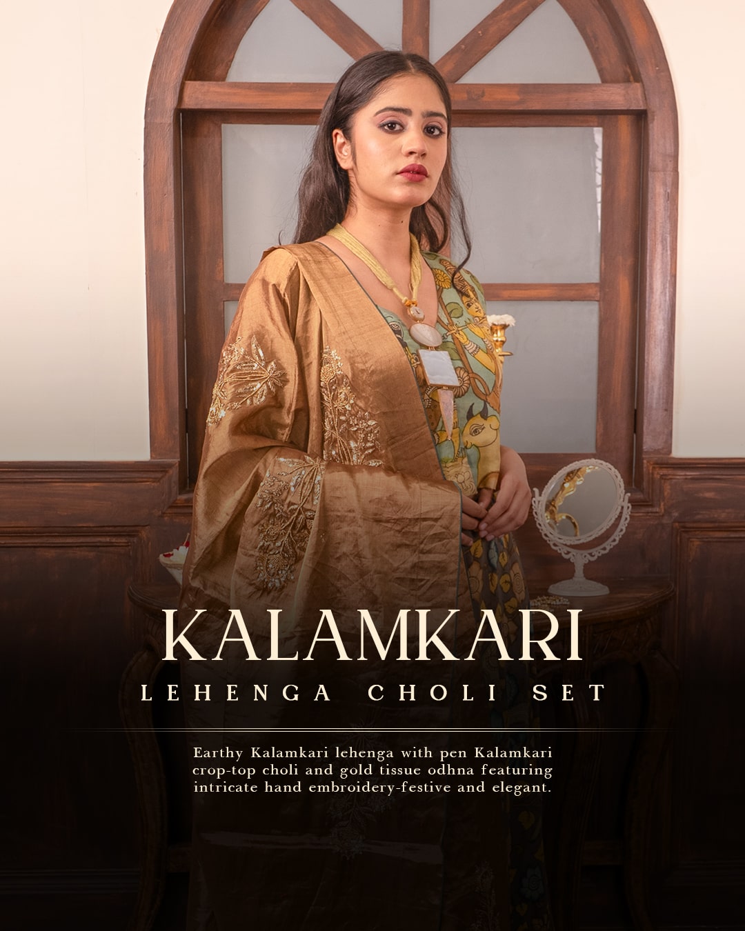 Rooted in tradition yet imagined with a contemporary spirit, the AGWA Kalamkari Lehenga Choli Set is an ode to handcrafted storytelling. The Bangalore silk lehenga showcases earthy hues of Kalamkari that reflect both sophistication and soul. Its coordinating choli — in a modern crop-top cut — is hand-drawn in pen Kalamkari, lending each piece a unique artistic identity. The set is paired with a gold tissue odhna, delicately hand-embroidered to add depth and finesse.