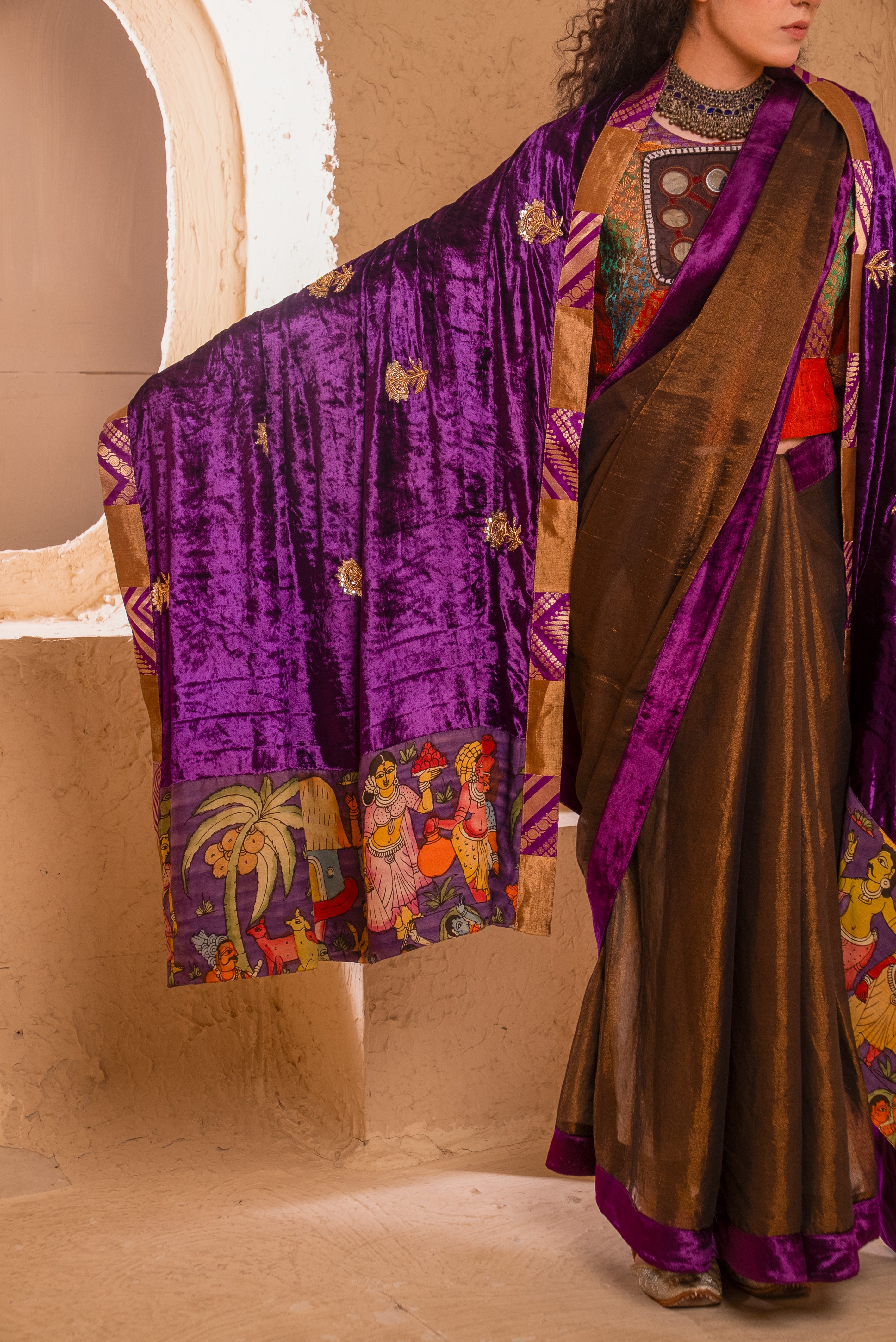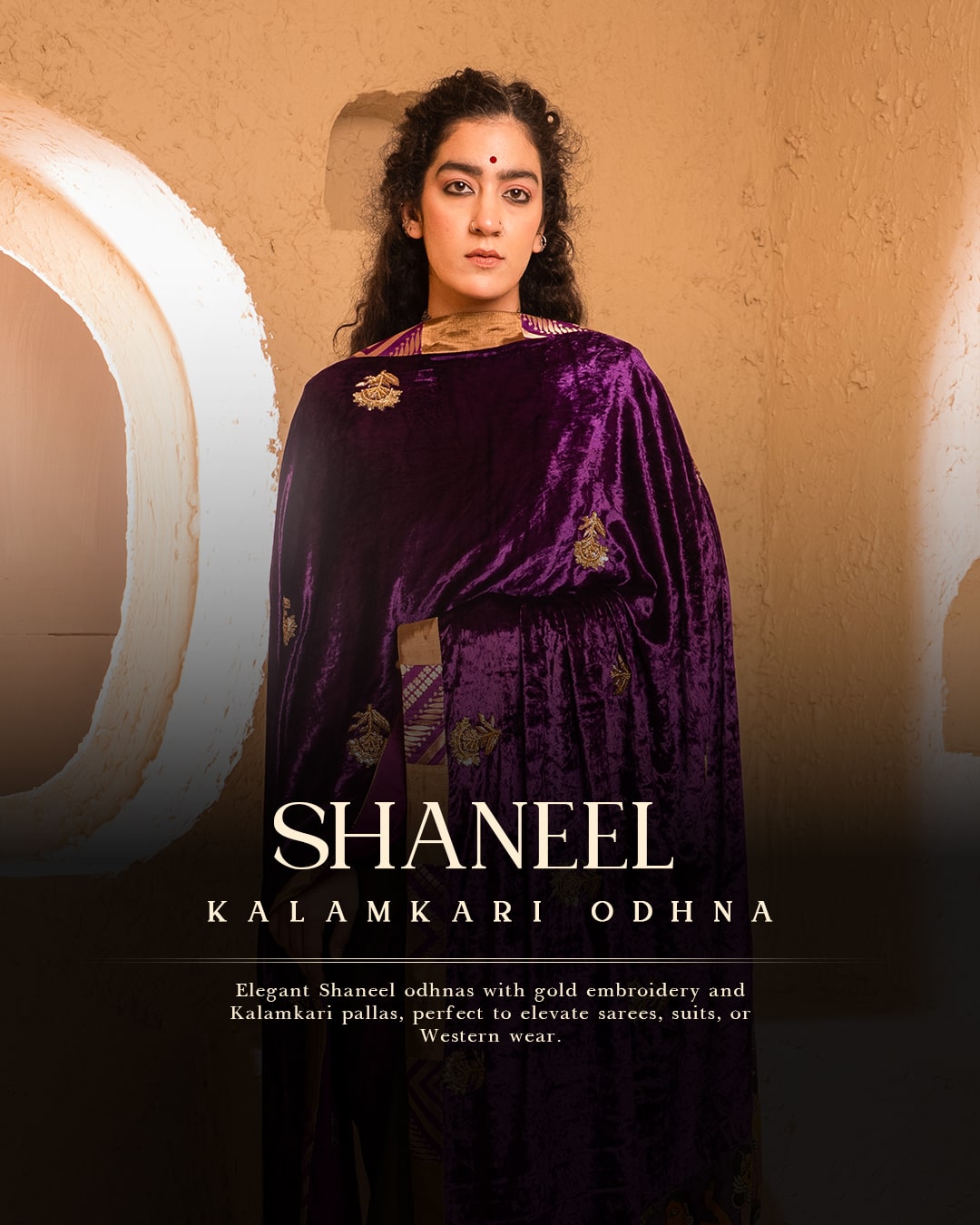 Enhance your ethnic wardrobe with the Shaneel Kalamkari Odhna, a perfect blend of artistry and elegance. Crafted from pure Shaneel fabric, this odhna features exquisite hand-embroidered gold motifs that catch the light beautifully, adding a subtle yet striking shimmer. The pallu is adorned with traditional pen Kalamkari artwork, showcasing India’s rich heritage in textile design.