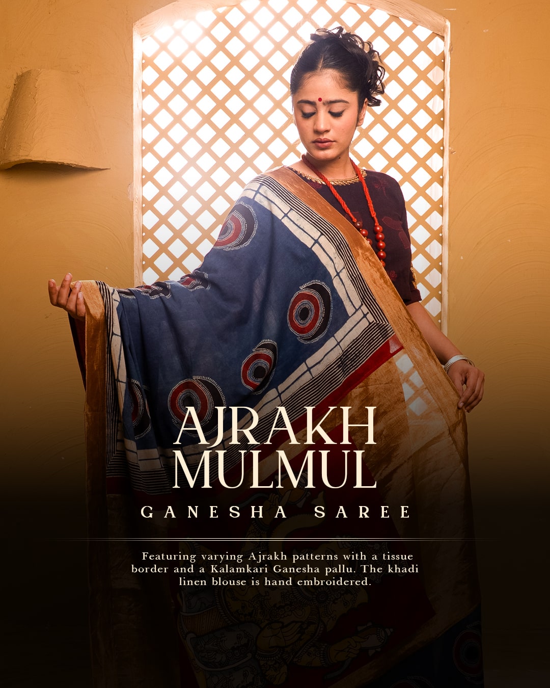 The Ajrakh Mulmul Ganesha Saree beautifully blends traditional craftsmanship with spiritual artistry. Soft, breathable mulmul fabric carries vibrant Ajrakh block prints, paired with a subtle tissue border that enhances its elegance. The highlight is the hand-painted Kalamkari pallu depicting Lord Ganesha, symbolizing wisdom and prosperity. The semi-stitched khadi linen blouse is hand-embroidered for added finesse.