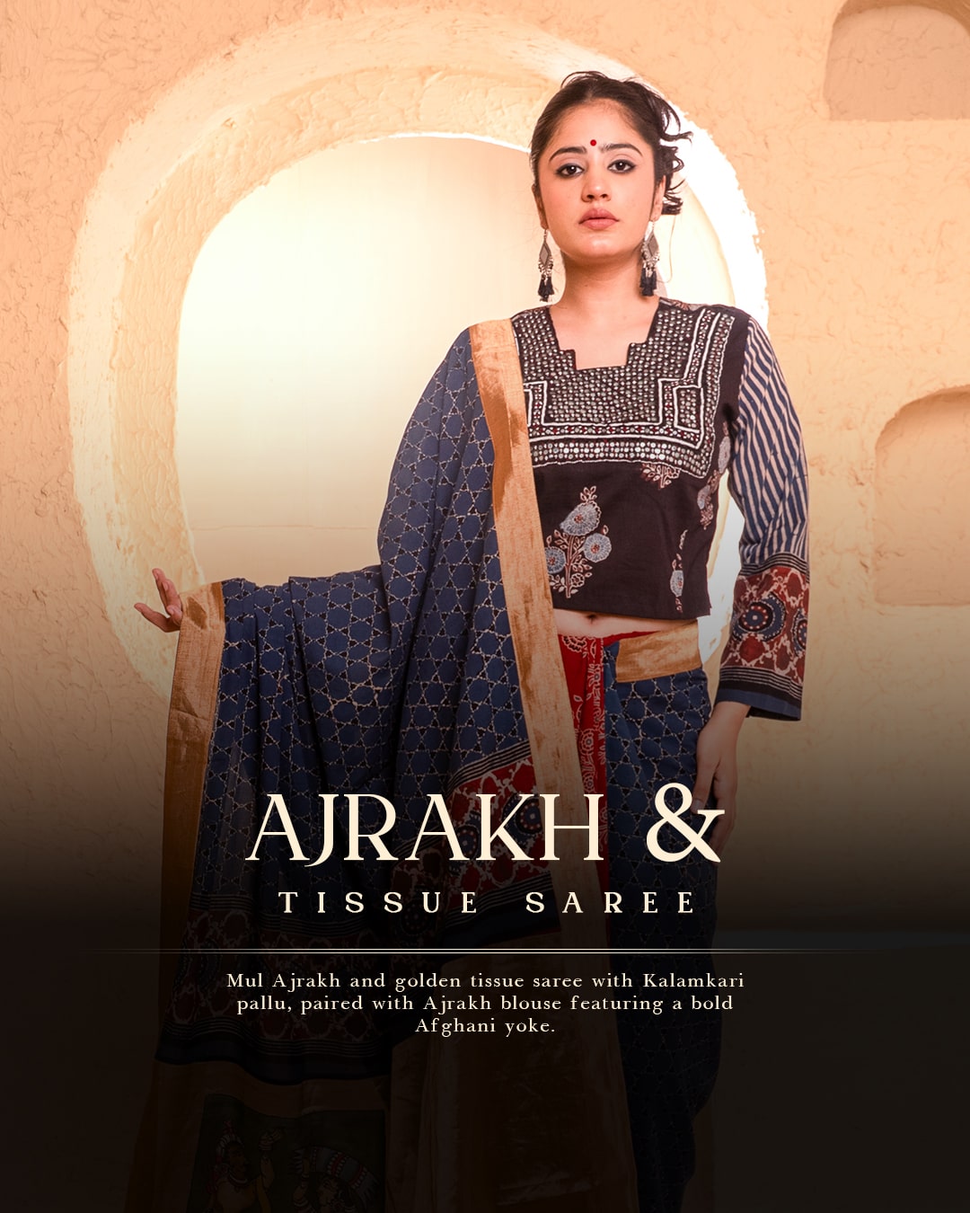 The Ajrakh & Tissue Saree artfully combines the rich heritage of mul Ajrakh cotton with the delicate sheen of golden handwoven tissue. Its standout feature is the pen Kalamkari pallu, showcasing detailed artistry that narrates timeless stories. Paired with a mul cotton blouse styled with a unique Afghani yoke, the ensemble blends cultural influences seamlessly.