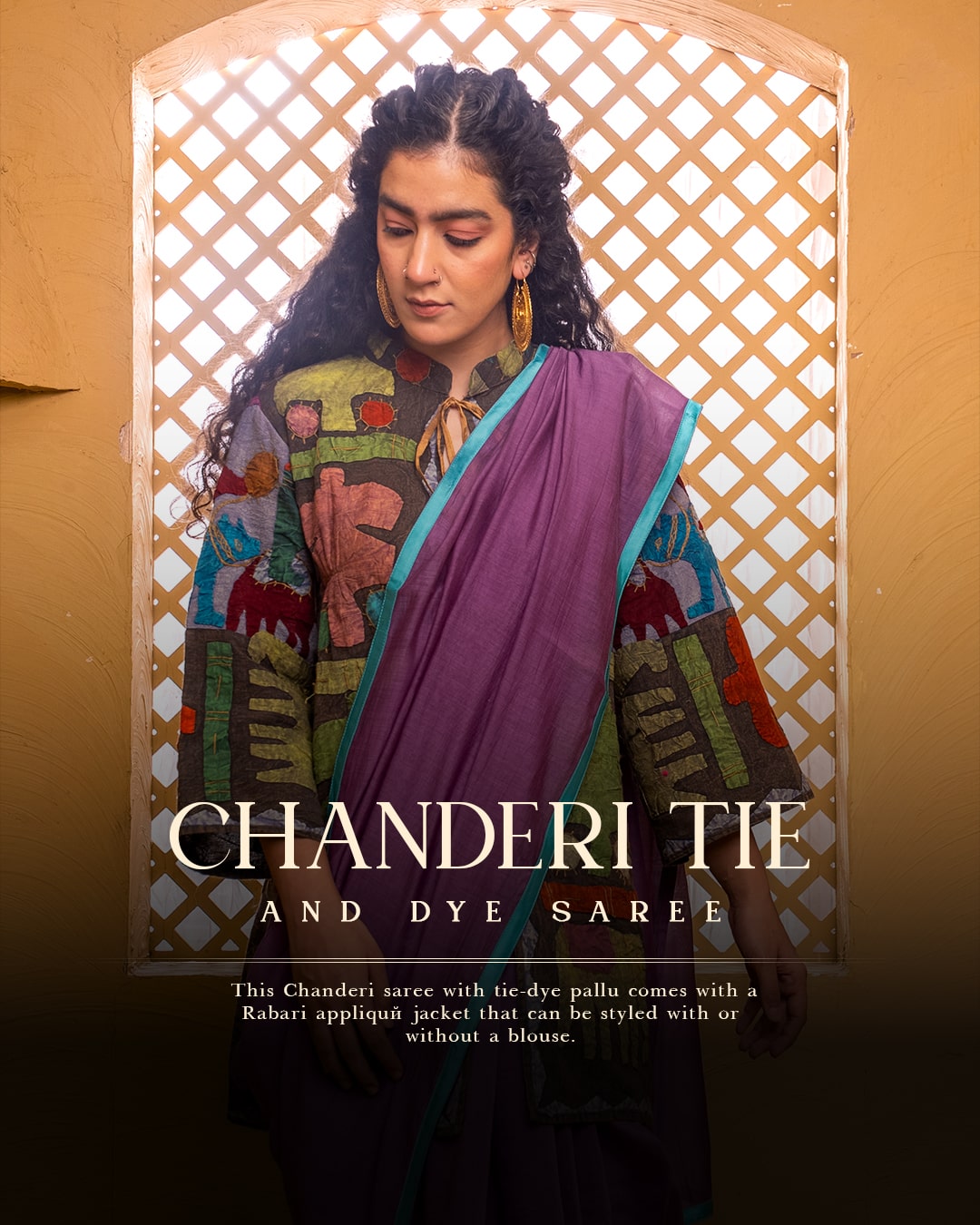 Crafted from featherlight Chanderi, this saree is an ode to movement and adaptability. Its tie and dye pallu introduces vibrant depth to the fluid drape, while the accompanying Rabari appliqué jacket becomes the hero element—wear it layered over a blouse, buttoned as a top, or standalone with the saree. Rooted in traditional craft yet imagined with contemporary flexibility, this saree invites playful styling for events, celebrations, or statement everyday wear.