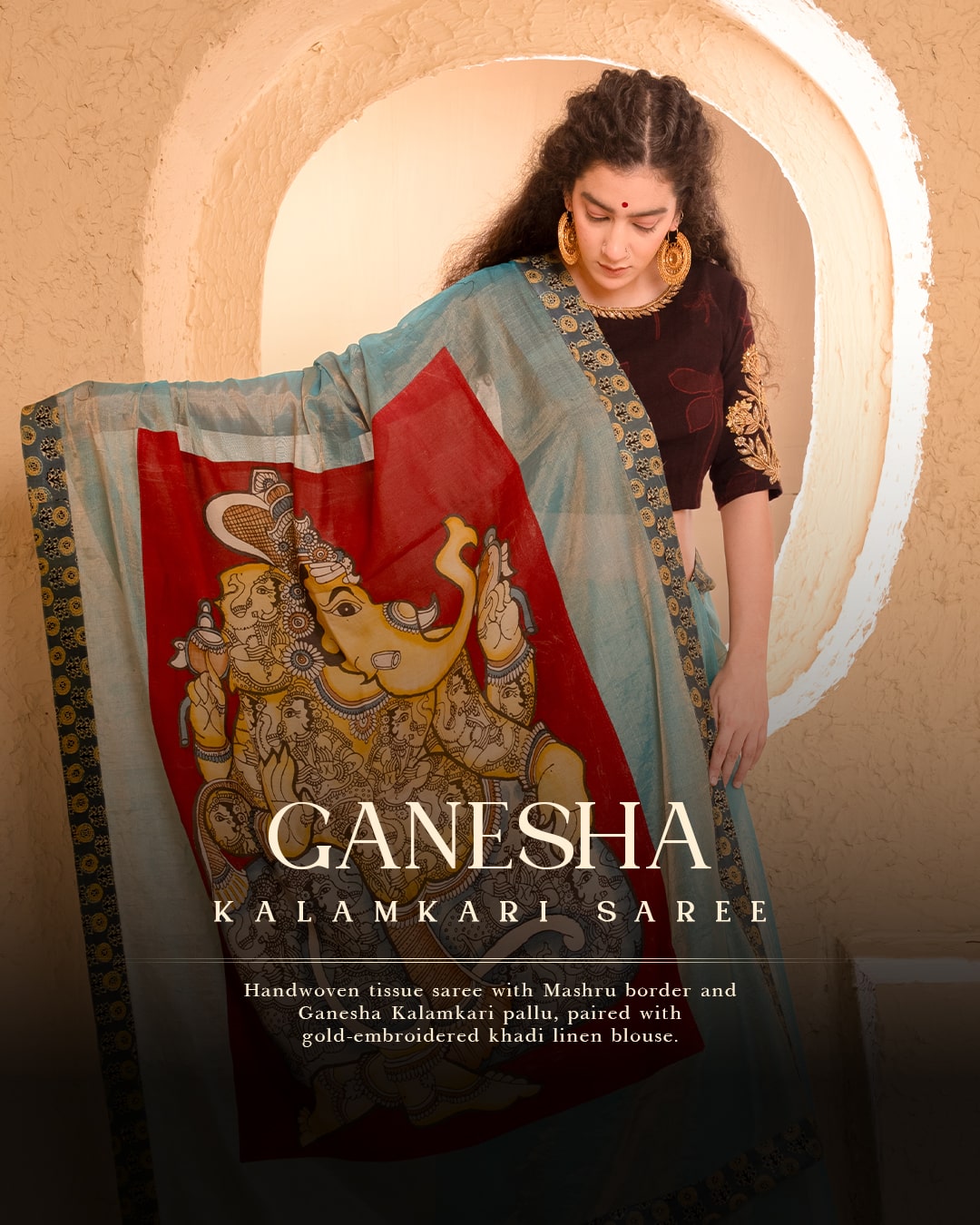 The Ganesha Kalamkari Saree celebrates divine artistry through its intricate handwoven tissue fabric paired with a sumptuous Mashru border. The saree’s highlight is the award-winning Kalamkari painting of Lord Ganesha on the pallu, bringing sacred symbolism and exquisite craftsmanship together. Accompanying the saree is a khadi linen blouse adorned with delicate gold hand embroidery, adding a touch of opulence.