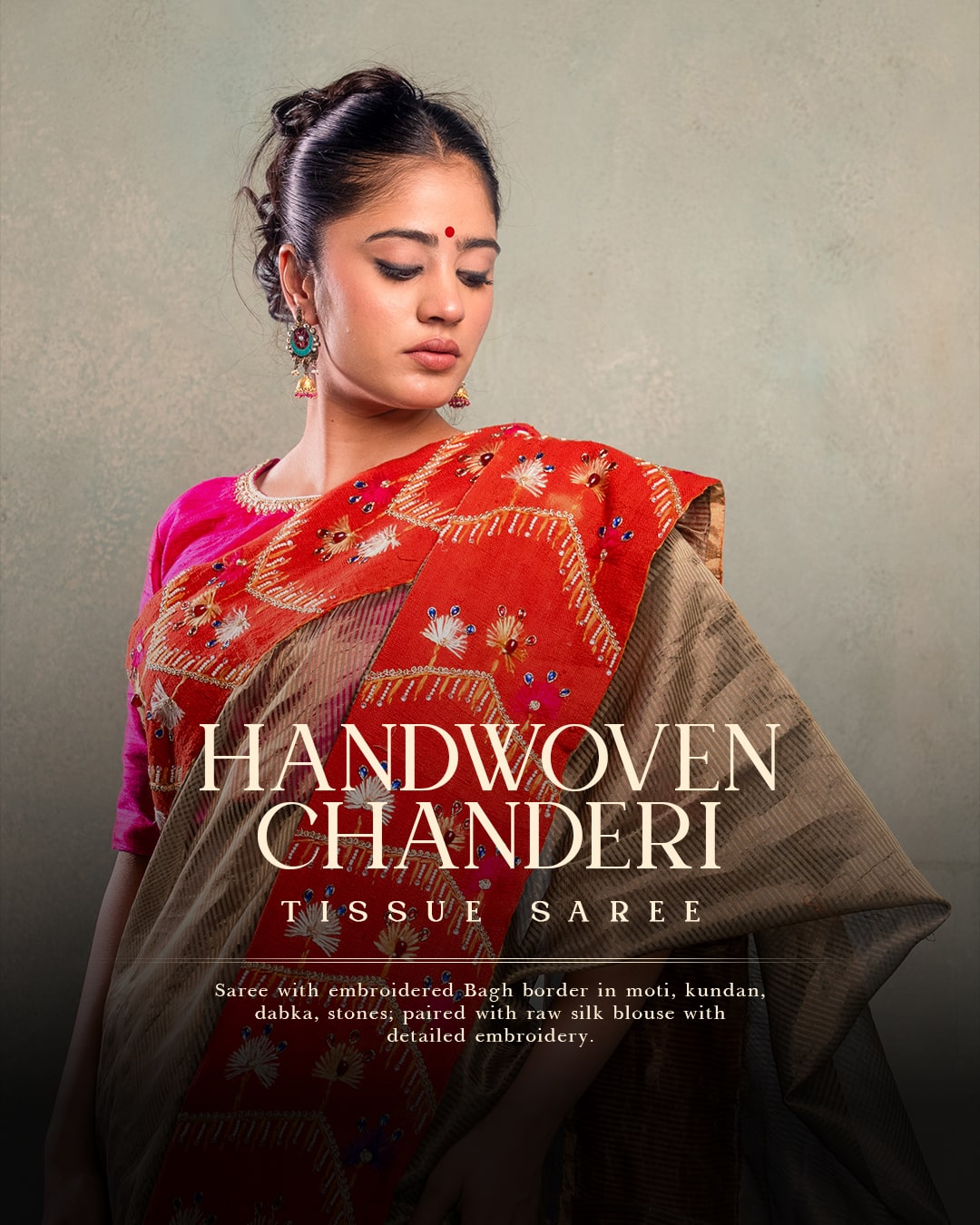 Woven from fine Chanderi tissue, this saree captures the essence of quiet luxury and Indian tradition. Its Bagh border is elevated with delicate hand embroidery using moti, kundan, dabka, and stones—each element meticulously placed for subtle sparkle and texture. The raw silk blouse is equally regal, with hand-embroidered detailing on the neckline and sleeves, offering balance and richness to the overall look.