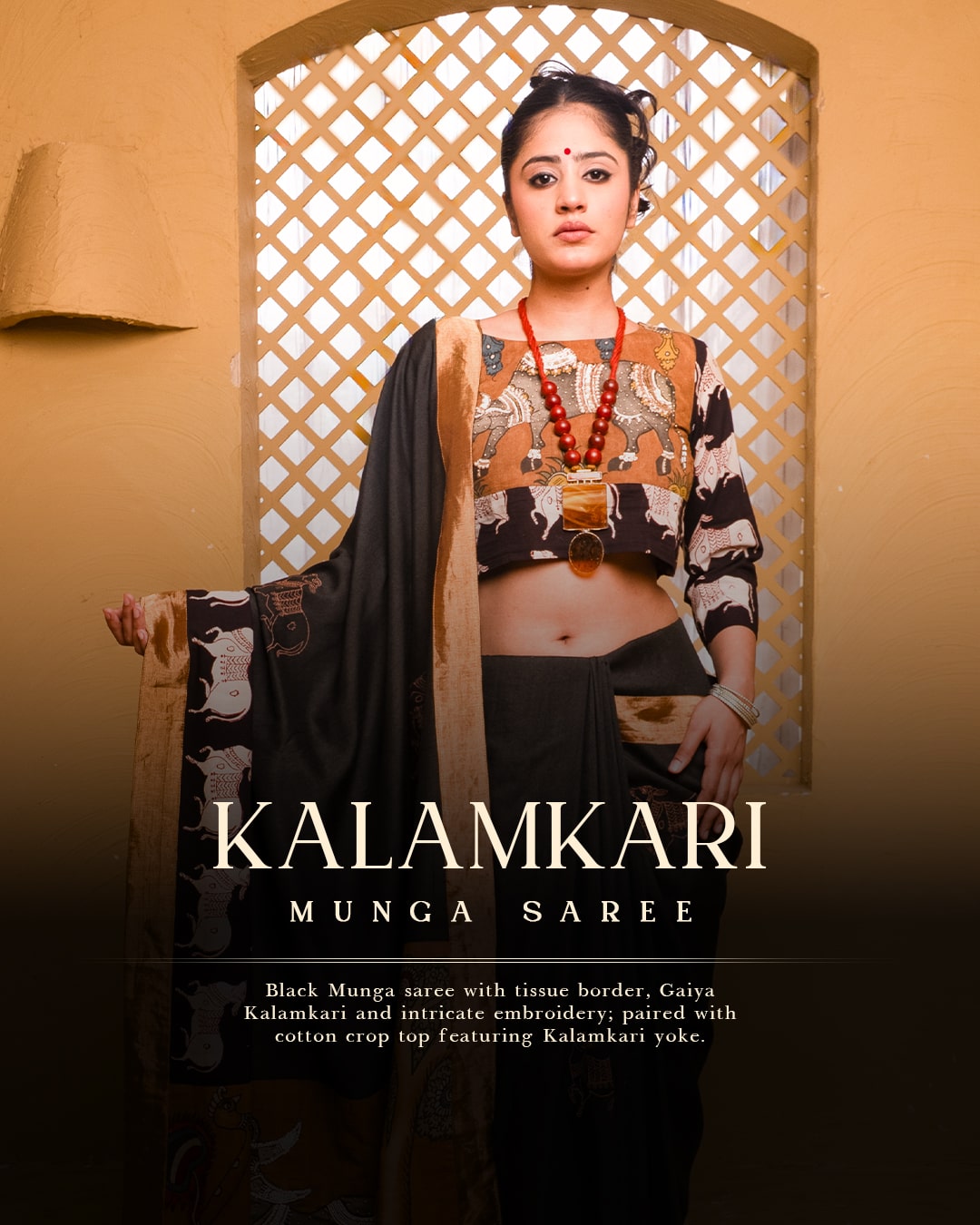 This exquisite black Munga saree is a canvas of tradition and craftsmanship. The highlight is the stunning Gaiya Kalamkari pallu—hand-painted with devotional artistry and further accentuated with rich embroidery using moti, naqshi, zari, and dabka. The luxurious textures of the saree are beautifully contrasted by a contemporary cotton crop top blouse, featuring a hand-embroidered Kalamkari yoke.