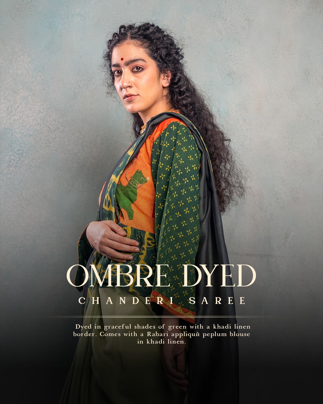 Woven in luminous Chanderi and dyed in gentle ombre shades of green, this saree channels grace with a modern twist. The soft color gradient flows effortlessly, complemented by a textured khadi linen border that lends earthy character. What sets this look apart is its accompanying Rabari appliqué peplum blouse in khadi linen—merging tribal artistry with contemporary tailoring.