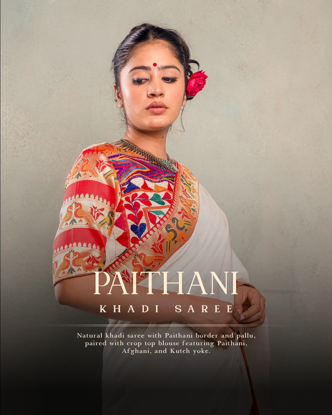 Woven in natural-toned handspun khadi, this saree speaks to quiet luxury and rooted elegance. Its classic Paithani border and motif-laden pallu pay homage to Maharashtra’s royal textile tradition. The accompanying cotton silk crop top blouse brings in an eclectic spirit through its yoke—blending Paithani weave, Afghani details, and Kutch embroidery. The design balances craft-rich tradition with relaxed sophistication, perfect for festive wear, cultural events, or conscious collectors of Indian textiles. Tailored for comfort and timeless in appeal, this saree tells a story across regions, brought together in one fluid drape.